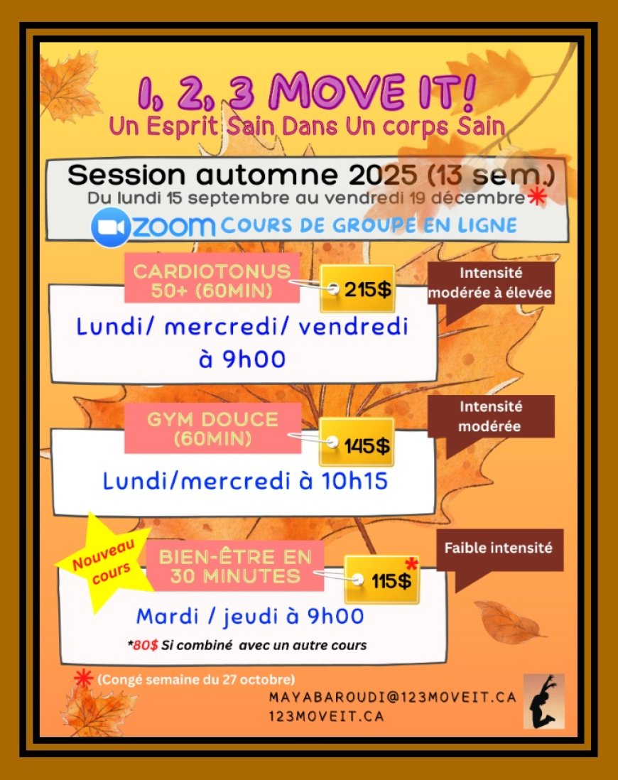 N.B. Si vous n'êtes pas disponible au jour et à l'heure où le cours se donnera, après chaque cours, vous recevrez par courriel un hyperlien pour assister en mode différé au cours au moment où ça vous conviendra.