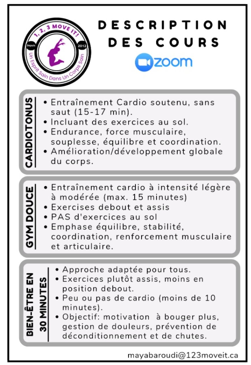 Elle vous enverra un lien internet « Zoom spécial » pour assister en direct au cours chez vous!