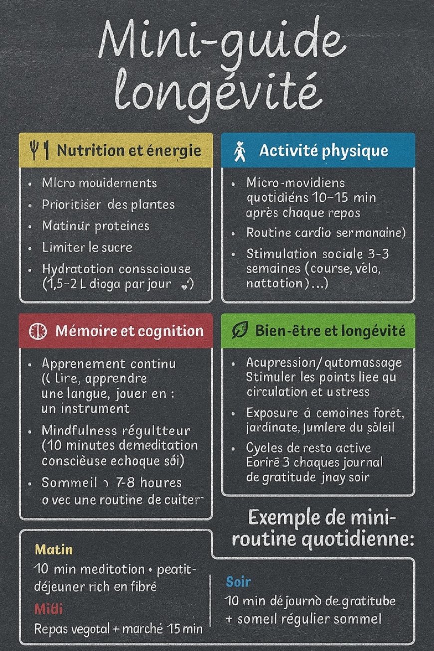 | Nutrition | - Manger jusqu’à 80 % de satiété - Prioriser légumes, légumineuses, fruits colorés - Limiter sucre et aliments ultra-transformés |